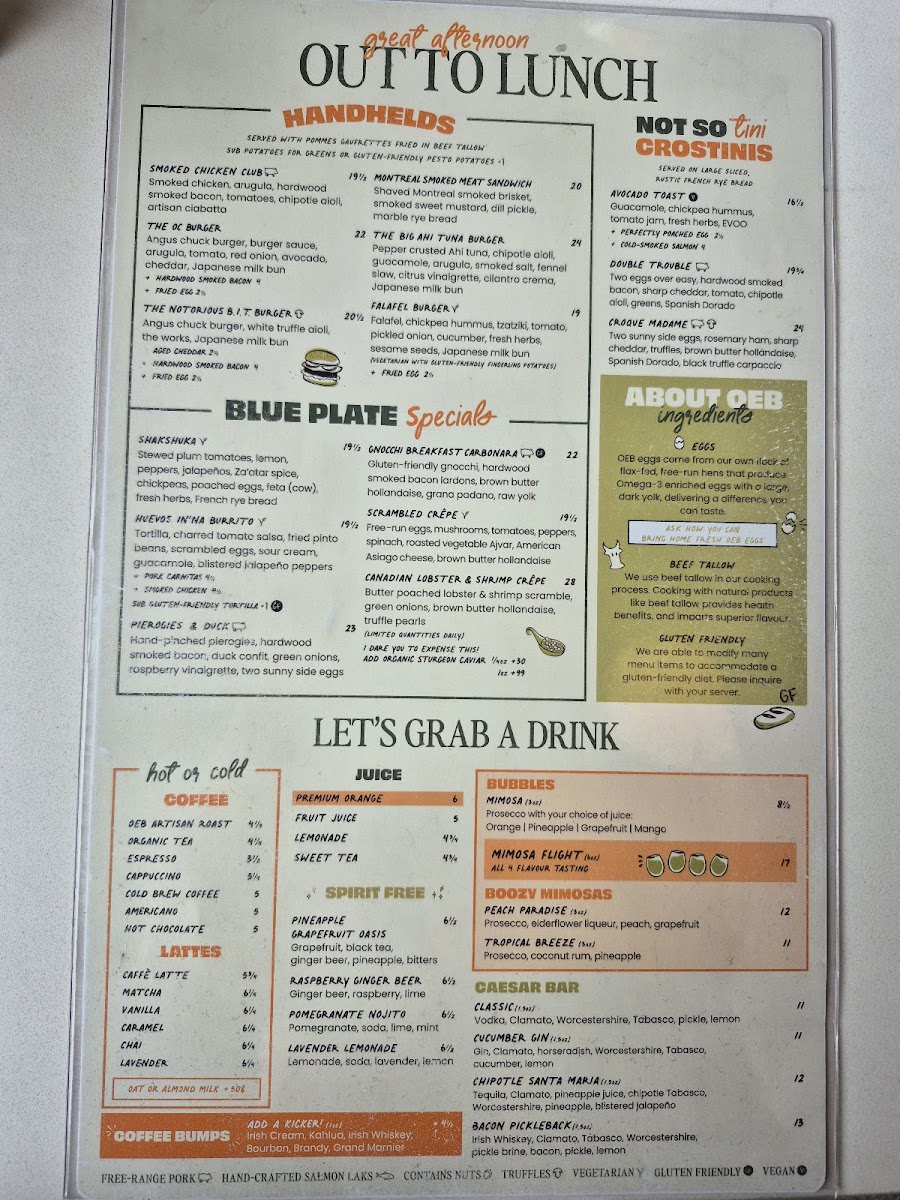 So happy to find an OEB outside of my home city of Calgary. I Still remember when they opened their first location right on Edmonton Trail...and now they are growing a breakfast empire. The food quality does not seem to suffer as they expand either. This meal was everything I have come to expect from OEB. Our service on this day was also 5 star, from start to finish. OEB continues to be a top tier dining choice no matter where in the world you find one.